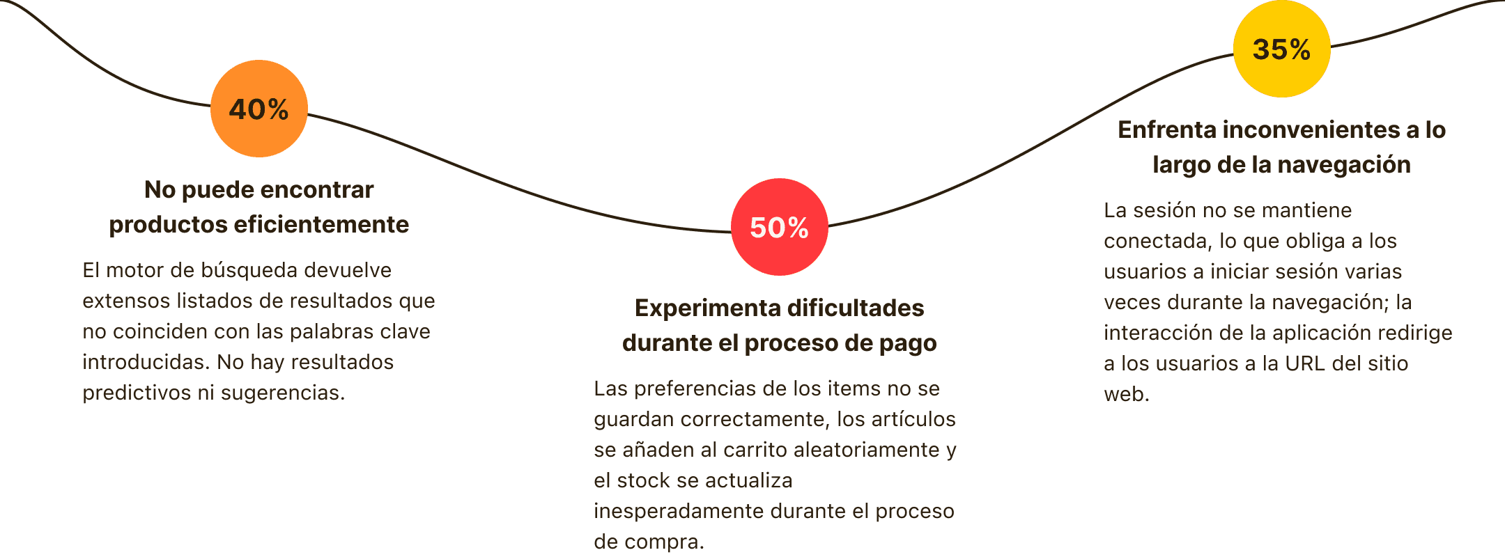 Durante las entrevistas de las primeras etapas de la investigación, los usuarios revelaron el camino que siguieron cada vez que interactuaban con la aplicación. La opinión general describió el 70% de las interacciones como negativas, incluyendo los flujos principales.