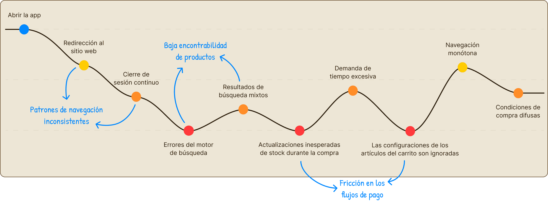 A través de la investigación de usuarios y el análisis de su comportamiento, identifiqué que los usuarios interactuaban con el producto pero no completaban compras debido a una incorrecta arquitectura de información, navegación fragmentada y fricción en los flujos de pago.